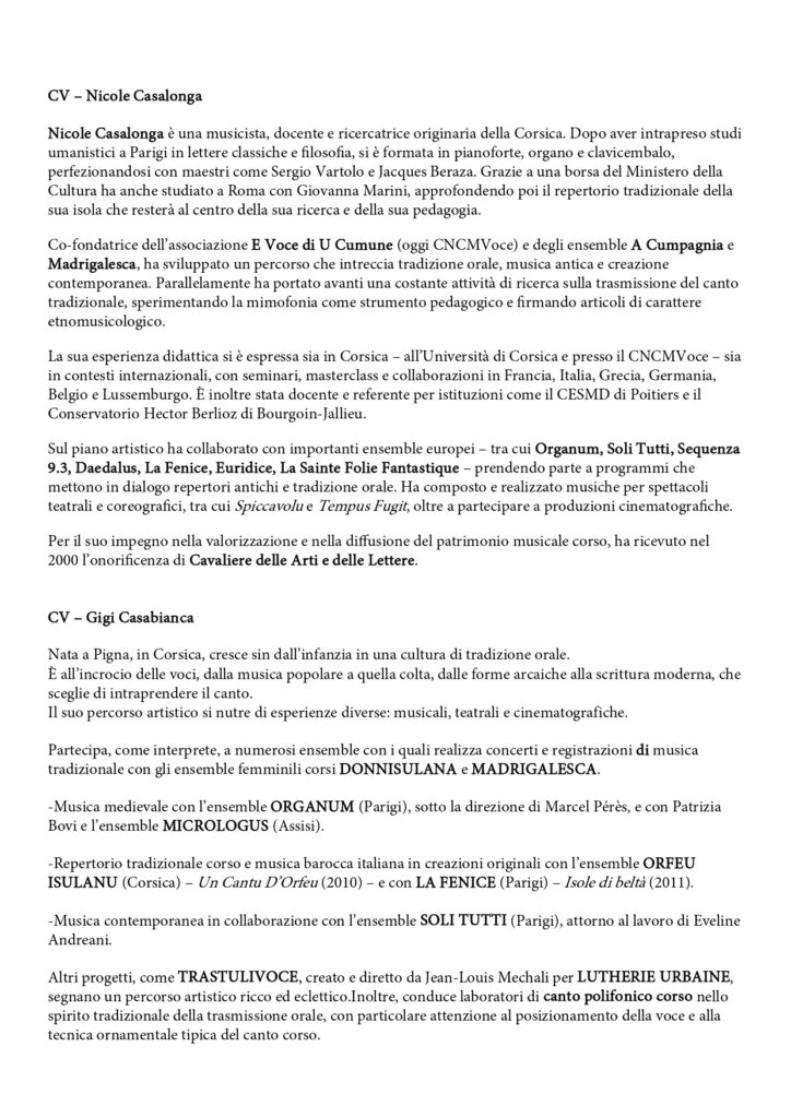Corso di Canto tradizionale Corsoby Goffredo Degli Esposti Corso di Canto tradizionale Corso con Nicole Casalonga e Gilberte Casabianca Dal 31 ottobre al 2 novembre 2025